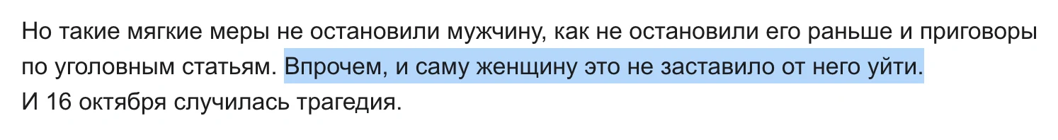 Не так — усё. Самае злачынства абясцэненае: «збіў», а не забіў, «сяброўка», а не жанчына, не чалавек. У артыкуле дэталёва апісаны забойца: яго алкагалізм, беднасць, «цяжкае жыццё», што гучыць амаль як тлумачэнне ці апраўданне. Пра ахвяру мы не даведаемся амаль нічога, апроч таго, што яна нібыта «сама не сышла» — класічны віктымблэймінг. Фармулёўка «здарылася трагедыя» прымяншае факт сістэматычнага гвалту.