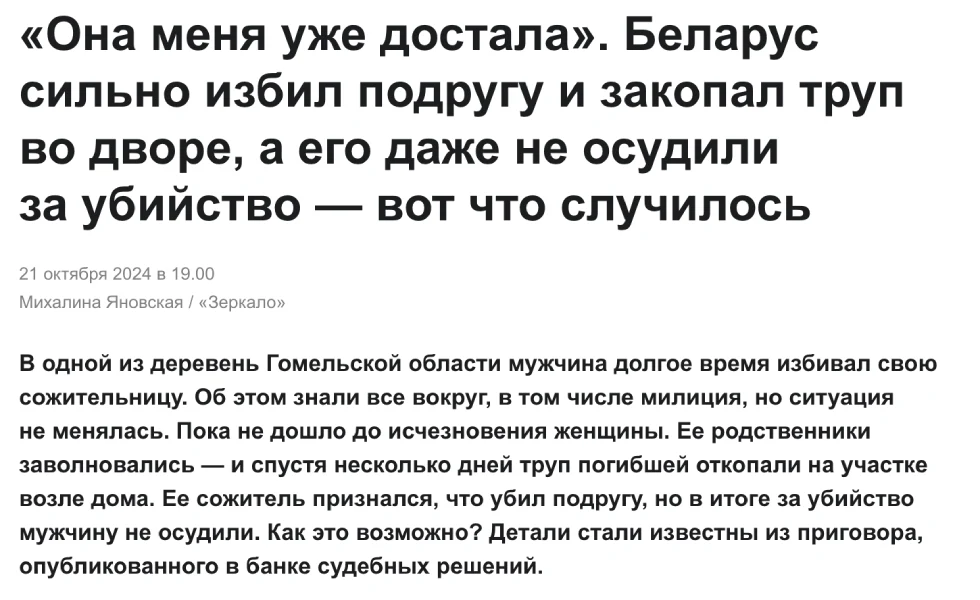 Дэталі ў загалоўку «закапаў труп у двары» працуюць на клікбэйт, а не на разуменне сутнасці — гэта сістэматычны феміцыд, а не «інцыдэнт». Жанчына пазбаўленая асобы, а мужчына, як і заўсёды, у цэнтры.