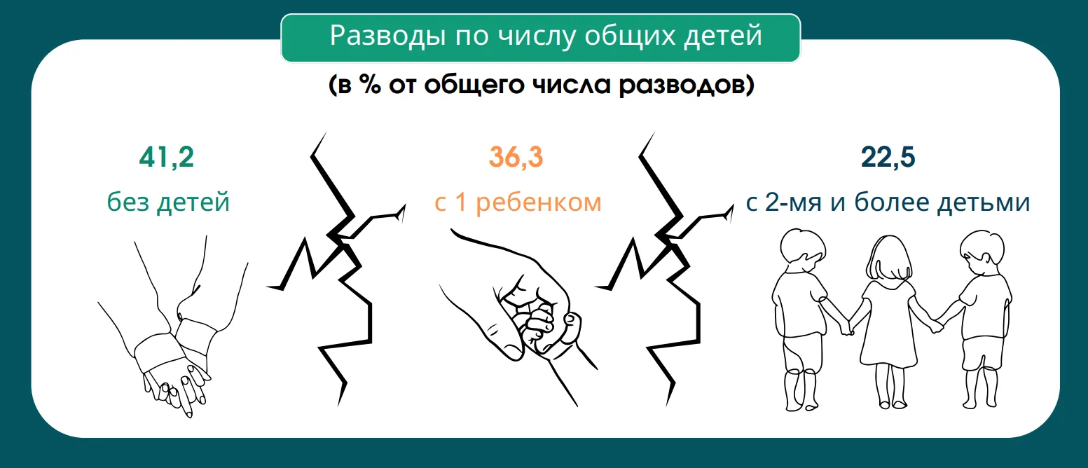 У 2024 годзе амаль 60% усіх разводаў у Беларусі адбыліся ў сем’ях з дзецьмі. Пасля разводу дзеці часцей за ўсё застаюцца з маці, а другі з бацькоў — адпаведна часцей за ўсё бацька — мусіць выплачваць аліменты на ўтрыманне свайго дзіцяці.