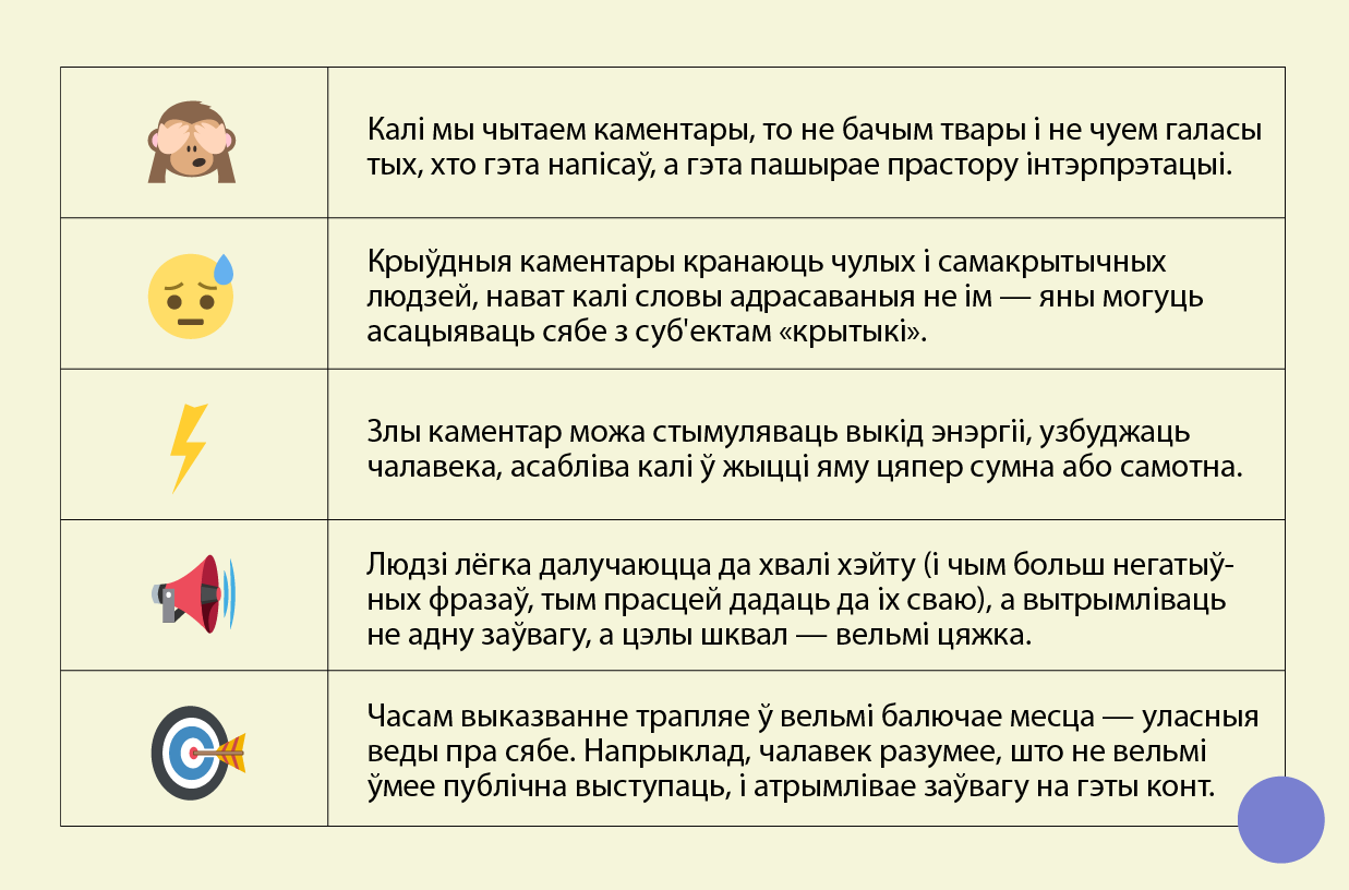 У любым выпадку важна разумець, што амаль любыя хэйтарскія ці зняцэньвальныя каментары — гэта больш не пра вас, а пра тых, хто іх піша.