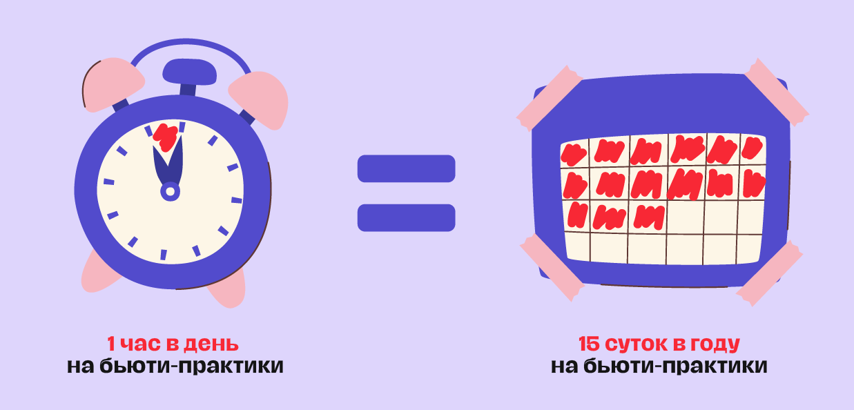Ведь наносить макияж действительно может быть приятно, правда? Но мы часто не задумываемся, сколько (в том числе и невосполнимых!) ресурсов тратим на бьюти-практики. Мы делаем их так часто и так регулярно, что все эти ритуалы стали негласной третьей сменой, которую мы добровольно выполняем с малых лет до самой смерти. А тратим мы, кстати, очень много: от часа до четырёх часов в день и от 184 до 240 евро в год (и это только расходы на косметические средства, без учета посещений салонов, процедур депиляции, маникюра и других бьюти-услуг).