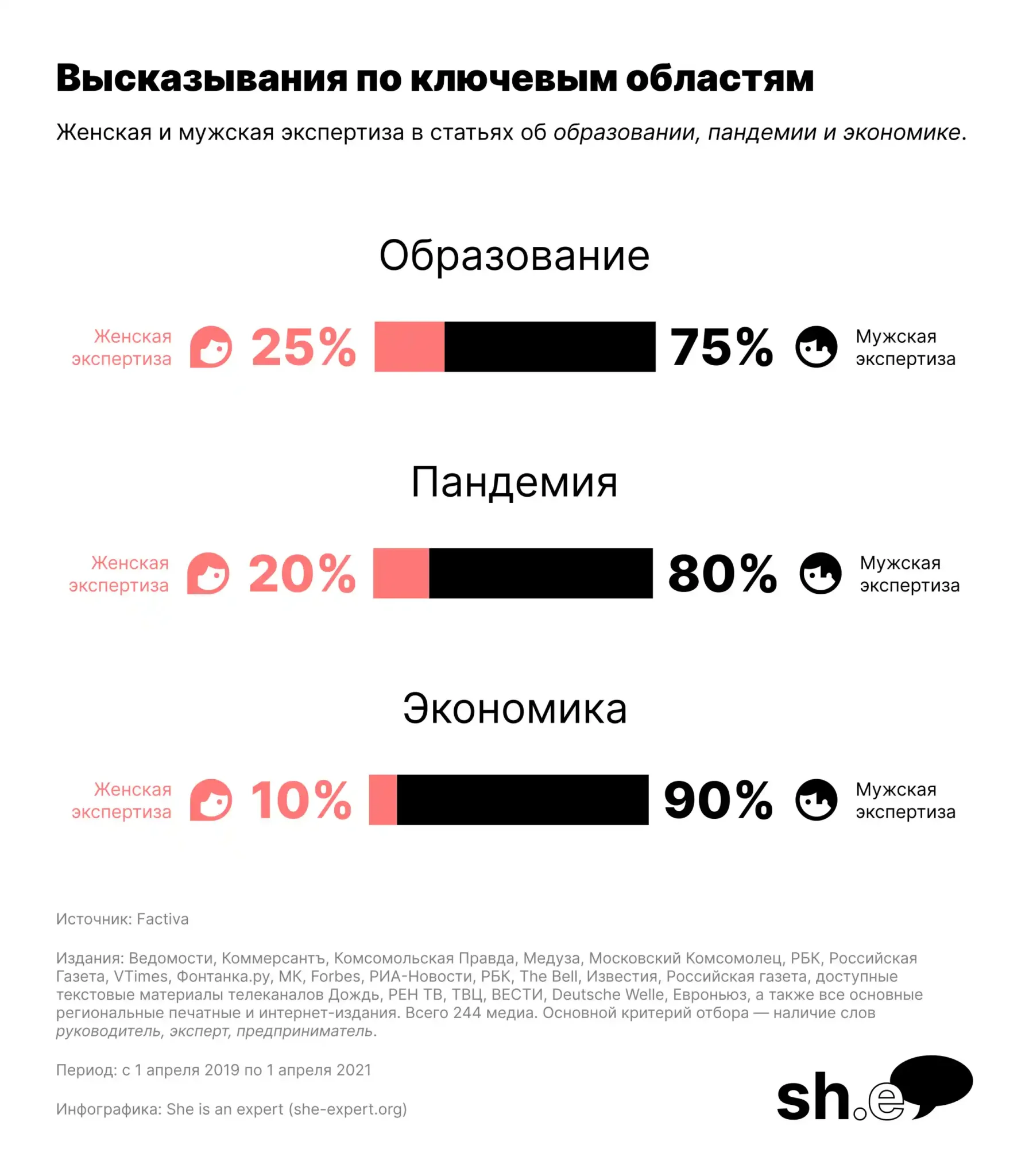 Если женщин и зовут как эксперток, то их эфирное время гораздо меньше, и чаще всего их зовут прокомментировать такие сферы, как образование и культура.